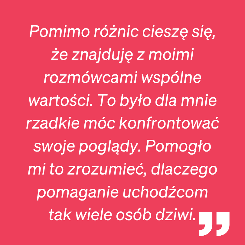 Wśród 10 rozmawiających byli między innymi: ● osoba zaangażowana w Ruch Obrony Granic, ● osoba działająca na rzecz uchodźców, ● osoba która żyła na emigracji i wróciła do Polski, ● osoba będąca w związku z obcokrajowcem, ● osoba obawiająca się wzrostu przestępczości na skutek imigracji. Zobacz rundę przedstawień – kim jestem?