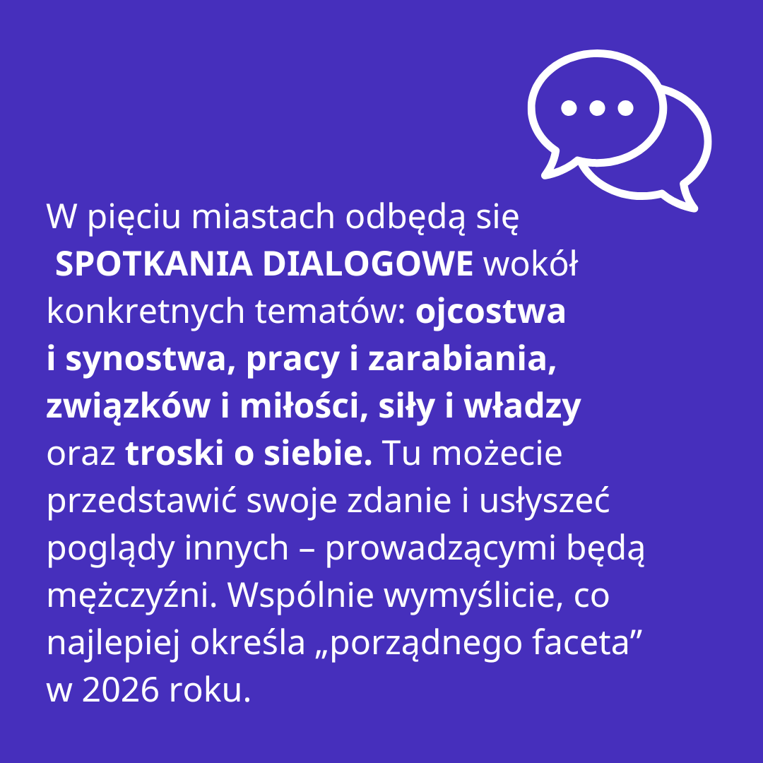 Co to znaczy, być facetem w Polsce? Kim jesteśmy? Jak widzimy swoją rolę, czego świat od nas oczekuje – a czego my wymagamy od siebie? Zapraszamy do rozmowy mężczyzn z całej Polski! Będziemy dyskutować o roli mężczyzn i uczyć się, jak lepiej rozmawiać.