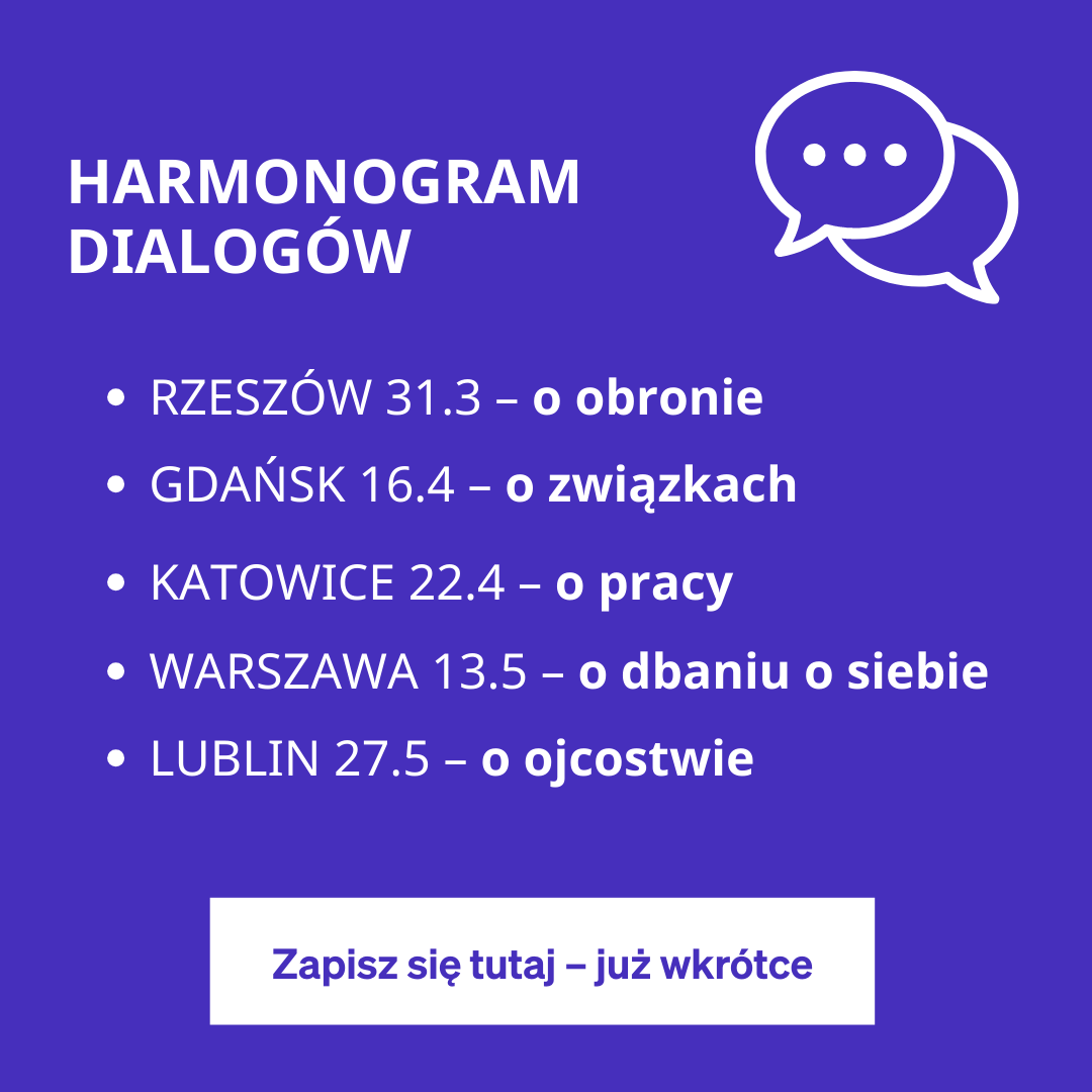Czyli: dialogi – w miastach, wokół tematów, a treningi – online, wokół umiejętności. To będą dwa różne typy spotkań, więc można zapisać się na jedno i drugie.