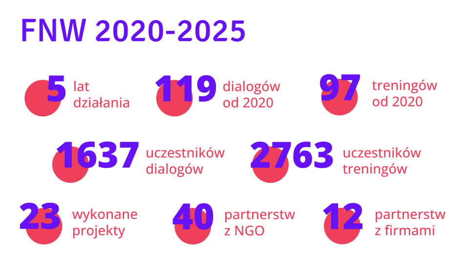 Nasz zespół liczy 20 osób. Są to osoby koordynujące projekty (Joanna Matera, Katarzyna Binda, Iwona Oskiera, Maja Jeśmanowicz-Mierzejewska), prowadzące dialogi i treningi (m.in. Konrad Sobczyk, Iza Meyza, Michał Jastrzębski, Agata Pietrzyk-Sławińska), prowadzące badania (Marta Szycman, Witold Chorąży), troszczące się o organizację pracy (Katarzyna Chrapka) i komunikację działań FNW (Beata Poprawa, Cecylia Płoszajska).