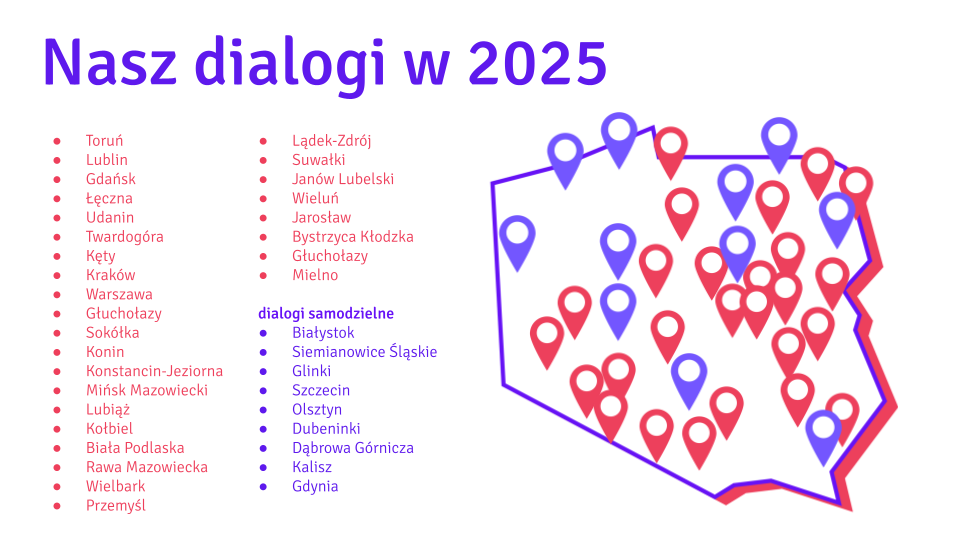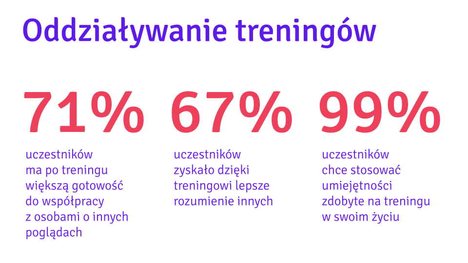 Naszą skuteczność mierzymy wpływem społecznym. Składa się na niego kilka miar: zasięg geograficzny i częstotliwość naszych działań, zmiana nastawienia i przekonań uczestników oraz zasięg i odbiór naszej komunikacji. Oto kilka danych: